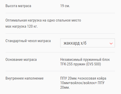 Матрас средней жесткости, универсален, он подойдет людям любой комплекции. Особенно комфортно будут чувствовать себя любители спать на спине. Конструкция матраса имеет высокий уровень ортопедической поддержки и не провоцирует заболевания, связанные с позвоночным столбом